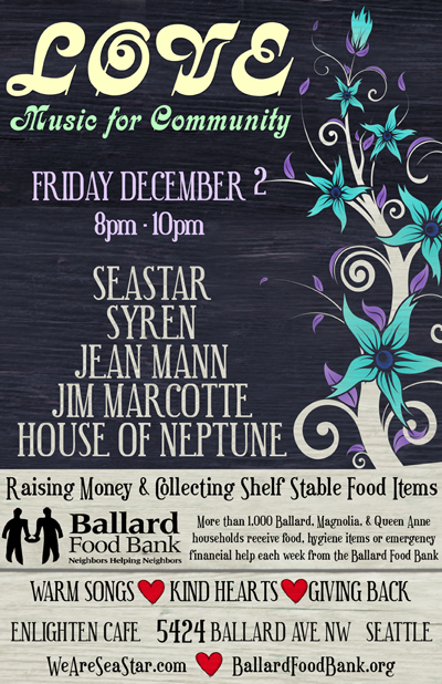 We played our second to last show of year on Friday, December 2 at Enlighten Cafe! I had an idea that I wanted to give back to the community. We had received so much this year, it just made sense to give back. I came up with LOVE ~ Music for Community. I wanted to host an evening featuring several bands and performers to raise money for a charity.